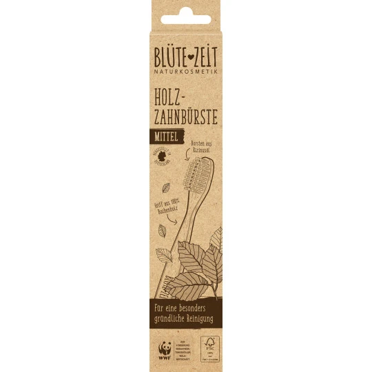 Aufgepasst, Zahnpflege wird jetzt gleich doppelt natürlich! Die neue BLÜTE-ZEIT Holzzahnbürste, in den zwei Härtegraden weich und mittel, sorgt nämlich nicht nur für eine gründliche Zahnreinigung, sondern schont auch das Zahnfleisch durch sorgfältig abgerundete Borsten aus Rizinusöl. Der Griff besteht zudem aus 100 Prozent Buchenholz. Und weil die richtige Zahn- und Mundhygiene schon bei den Kleinsten anfängt, gibt es auch die BLÜTE-ZEIT Kids Holzzahnbürste – natürlich in extra weich.